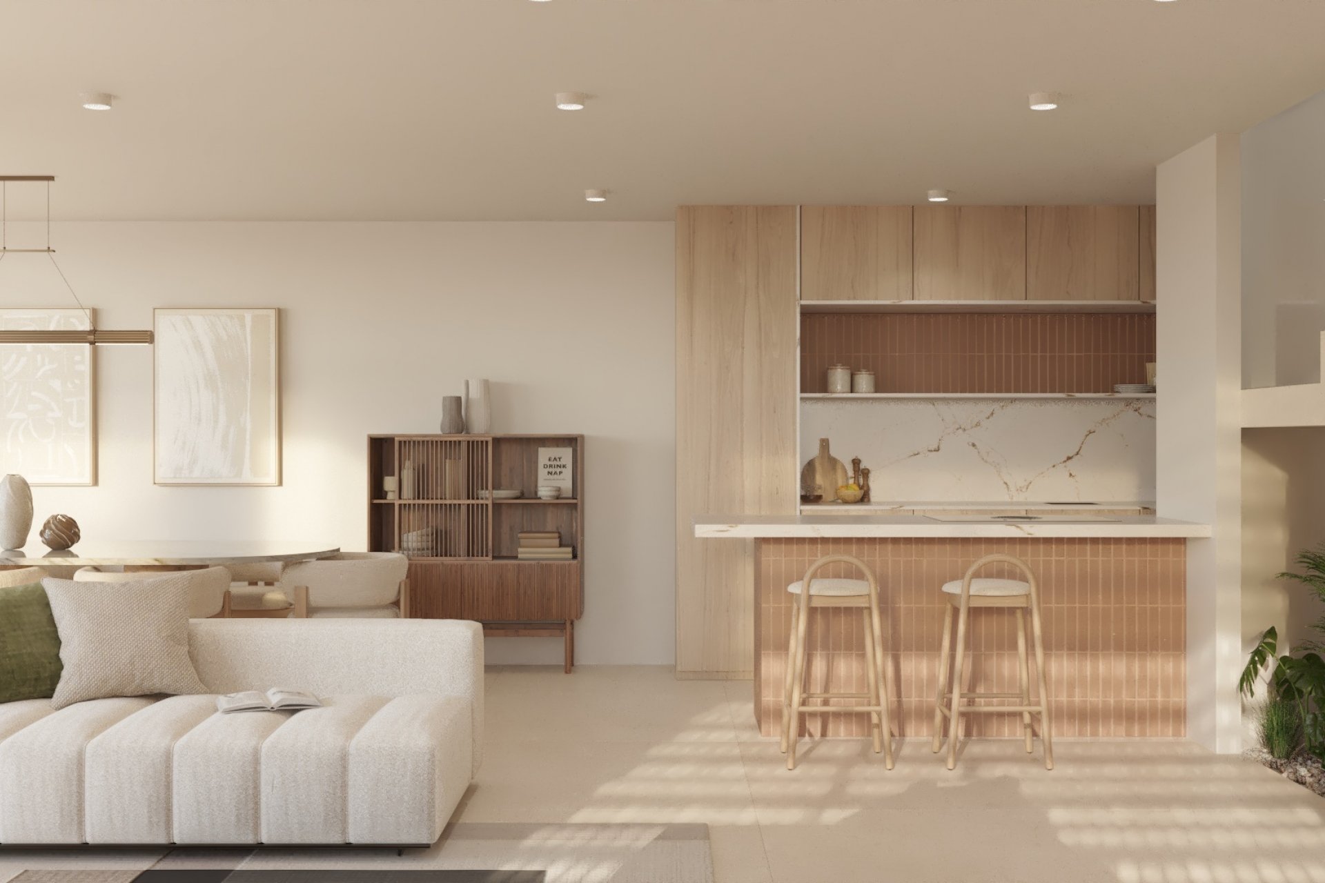 Het interieur van de villa's is ontworpen met een focus op comfort en functionaliteit. Elke woning beschikt over vier slaapkamers en drie badkamers, wat een ruime en goed ingedeelde ruimte biedt voor het hele gezin. De vloeren van porseleinen tegels voegen een vleugje elegantie en duurzaamheid toe aan de ruimtes. De villa's zijn uitgerust met airconditioning, wat het hele jaar door een aangename sfeer garandeert. Ingebouwde kasten bieden efficiënte en discrete opslag. Bovendien beschikken de woningen over een garage, wat comfort en veiligheid voor de voertuigen biedt.