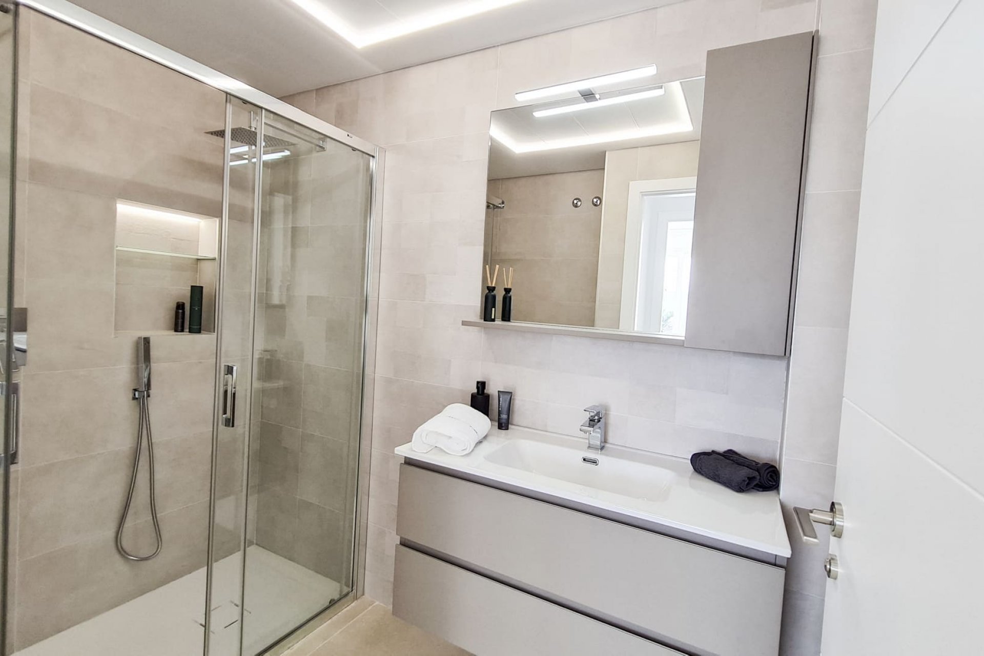 Het interieur biedt een ruime en lichte ruimte, met porseleinen vloeren van topkwaliteit, gladde witte kunststof verf, witgelakte deuren, modulaire kledingkasten met LED-verlichting en een kleedkamer in de grote slaapkamer. De keuken is uitgerust met Balay apparatuur en compacte marmeren of Silestone werkbladen. De badkamers hebben wandhangende toiletten, gelakte badkamermeubels, ingebouwde kranen, antislip douchebakken en veiligheidsglazen schermen.