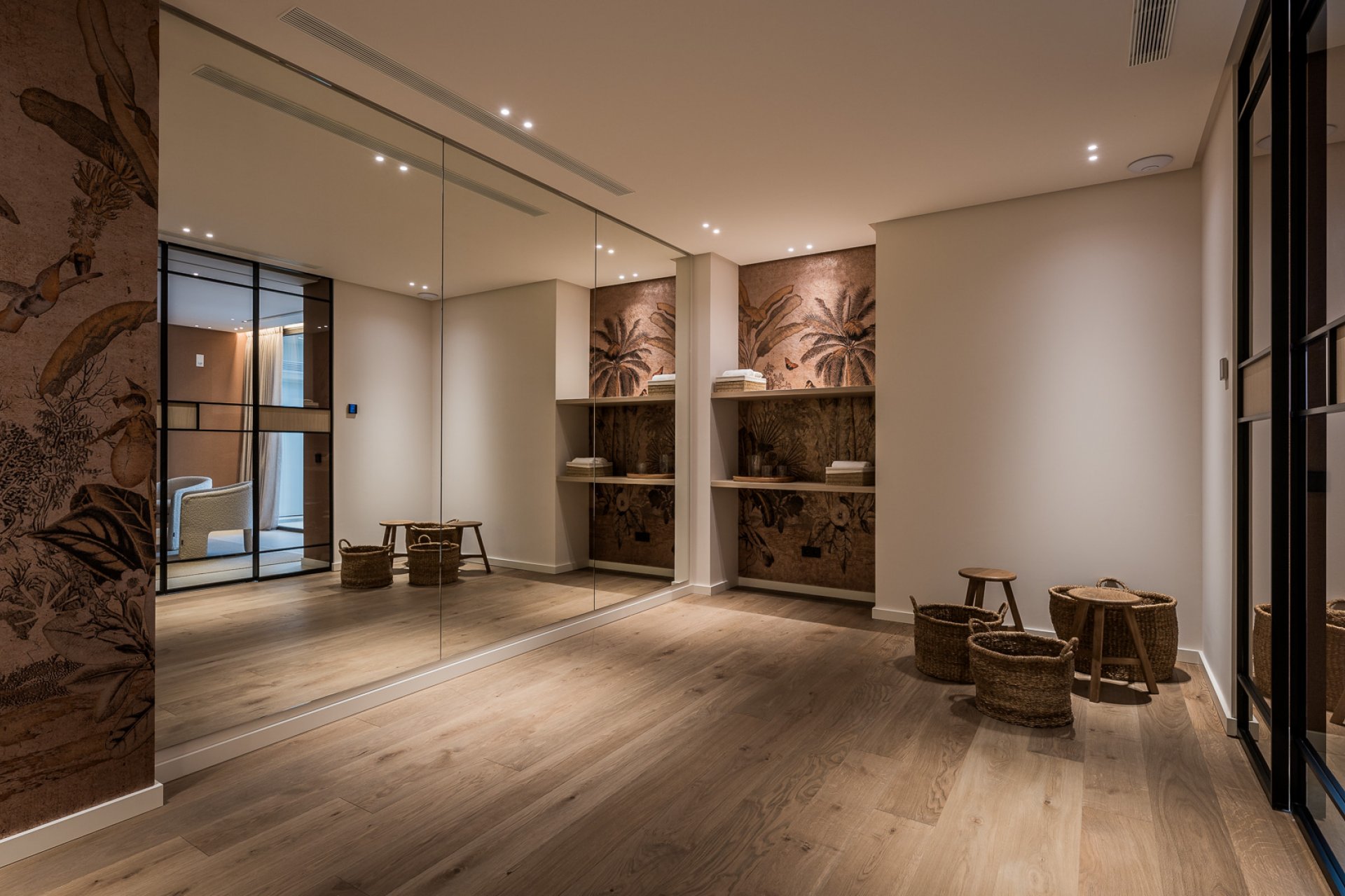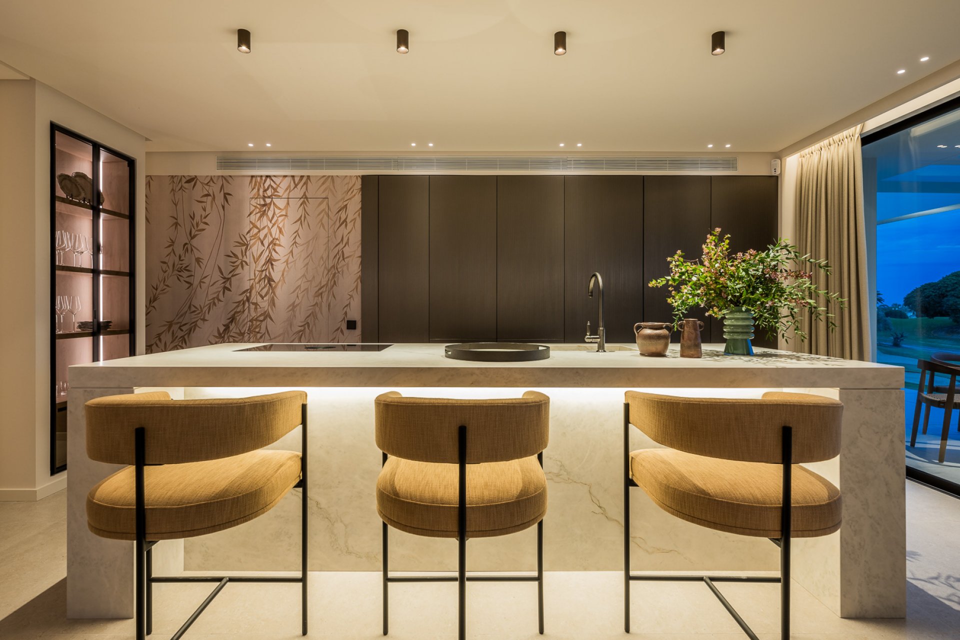 De binnenruimtes weerspiegelen een verfijnd en modern ontwerp, ontworpen om het comfort te maximaliseren. Hoofdruimte: Een open ontwerp verbindt de keuken, eetkamer en woonkamer, overspoeld met natuurlijk licht door glazen deuren van vloer tot plafond die het uitzicht op de golf omlijsten. Slaapkamers: De villa heeft vier en-suite slaapkamers, elk met een eigen terras. De hoofdslaapkamer, van bijna 40 m², heeft een kleedkamer en een designerbadkamer in een open lay-out, die het gevoel van een luxe suite oproept. Kelder: Extra ruimtes zijn onder andere een fitnessruimte met donkerhouten afwerking en een kantoor aan huis, ideaal voor wellness en productiviteit.